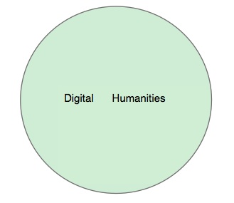 Here's the first diagram, and I think it represents the conventional view of the digital humanities. Obviously it suggests that there is a vast realm of things that are digital and a vast realm of things that are the humanities and that some relatively small portion of these things overlap. It is a model of specialization. Maybe there are people who are digital humanists the way there are people who are Victorianists: a specific area of study for which one gets hired. Or maybe there are people who are digital humanists the way there are people who are feminists: a specific set of methods that might be applied to various areas of study. And these things can overlap. I'm sure there is at least one feminist, digital humanist, Victorianist out there. It is also a model that defines "digital" and "humanities" in ways that keeps the two mostly separate. Most humanities activities are not digital, and most of what might be called "digital" is outside the purview or interest of the humanities.