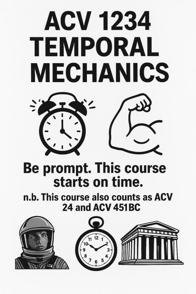 ACV 1234: Temporal Mechanics (course description: Be prompt. This course starts on time. n.b. This course also counts as ACV 24 and ACV 451BC). We are still workshopping our promotional materials for this one.